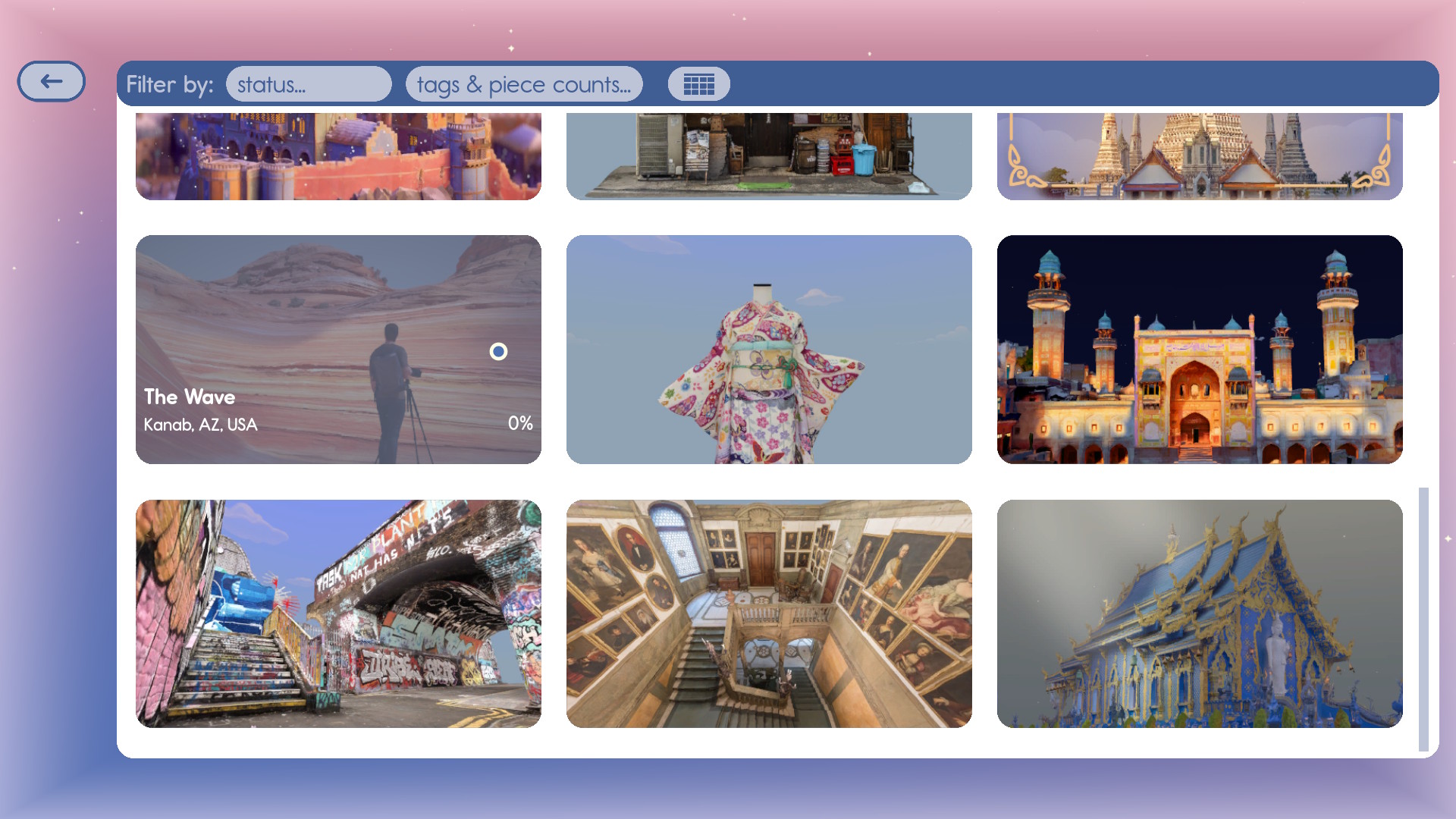 Puzzles have been around for hundreds of years and while the main design stayed quite similar for much of that time, a number of years ago now, we started seeing 3D jigsaws. All of that is well and good but there has been a big problem with physical puzzles… the potential for lost pieces (when you are building up as well as outward the chance for a piece to fall and get lost is greater). While there are some attempts to minimise this… puzzle mats to roll up your work when you aren’t actively using them… it’s still a bit fiddly. There are quite a few 2D jigsaw games available these days… but I don’t think I’ve seen a 3D jigsaw game before… until Puzzling Places. Not only is it 3D, but it can be played in VR for the full 3D effect and many of the scenes also include animated elements which add a lovely sense of life to them.