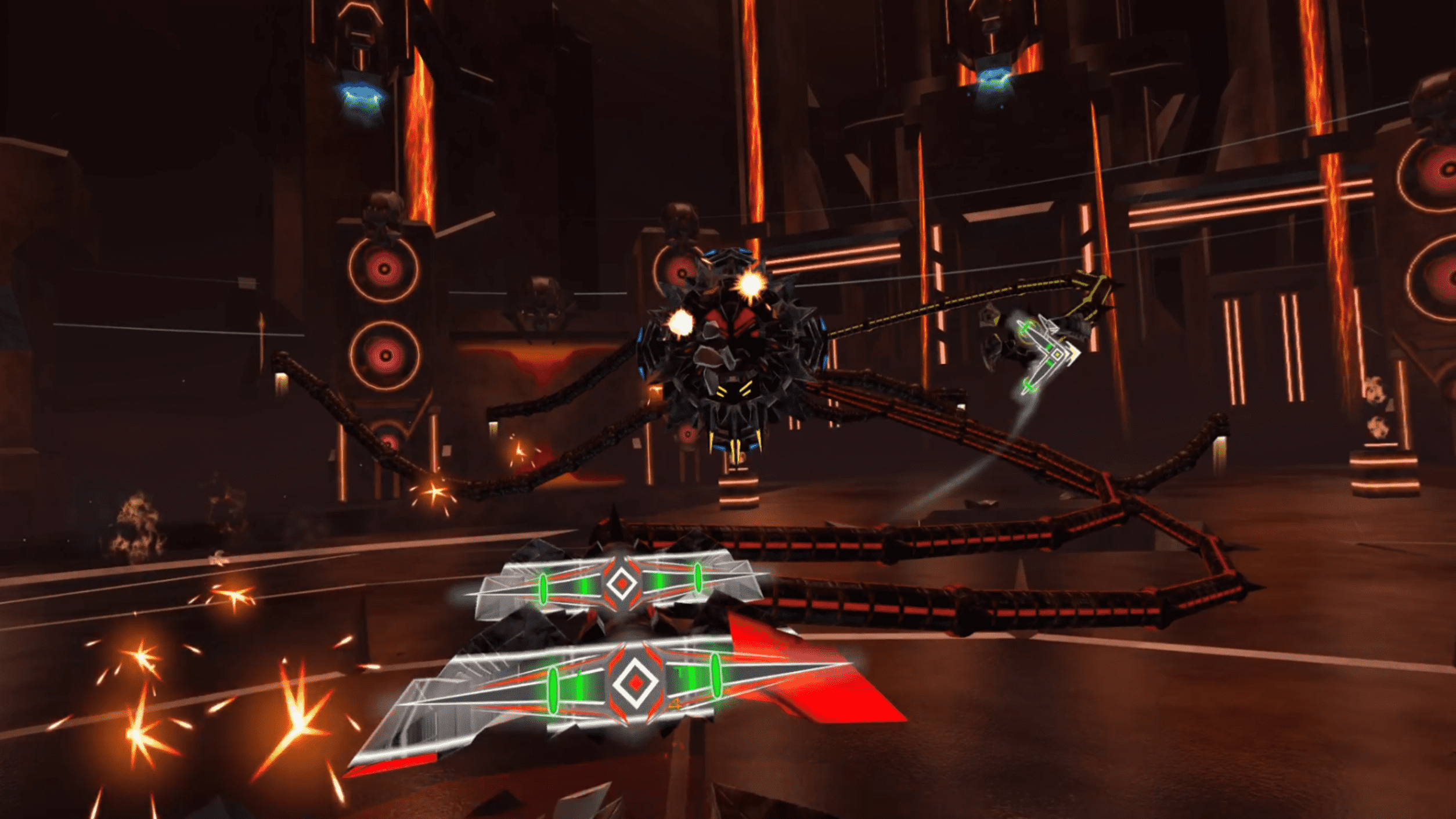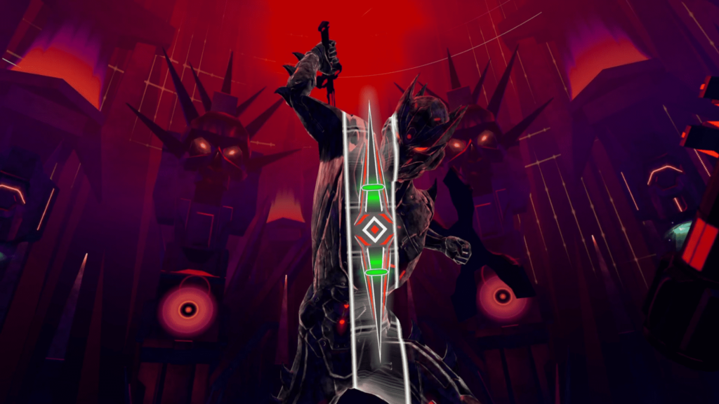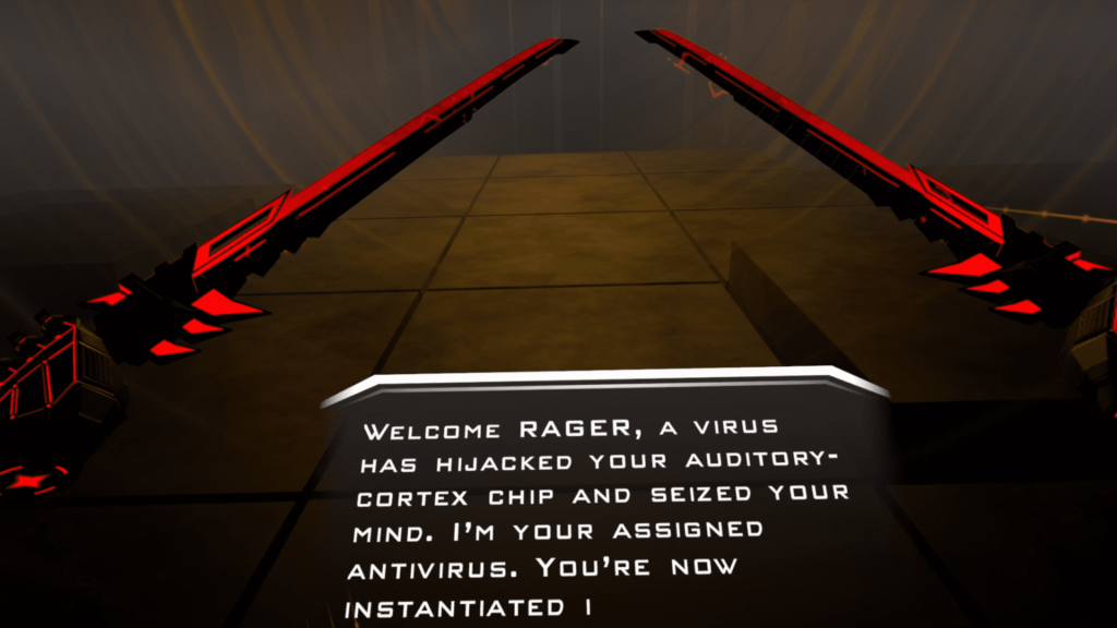 You take on the role of a warrior known only as RAGER. A malicious virus has hijacked the auditory cortex chip implanted in your head and effectively taken control of your mind. A strange digital voice acts as your antivirus guide and pulls you into the music system itself where the virus now lives. From there your only way out is to literally fight your way through the rhythm. The digital world is ruled by three massive machines named Tentacron, Swarmex, and Serpentox. As you move through each level you get closer to confronting these bosses and reclaiming control of your mind. The story never goes particularly deep, but it works well as a simple framework that connects the action together and gives you a reason to keep pushing forward through the music driven arenas. One thing that may turn some people off is that the guide who talks you through tutorials and transitions appears to use AI generated voice work. If you are strongly against that type of technology it might stand out more than the developers intended.