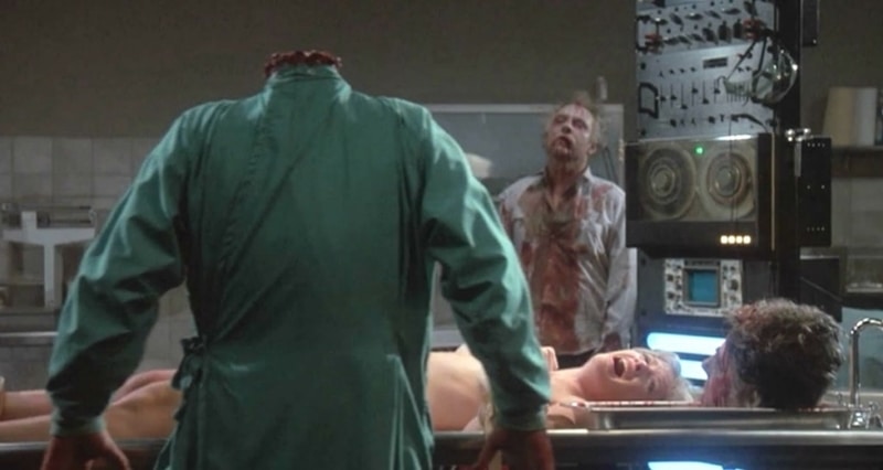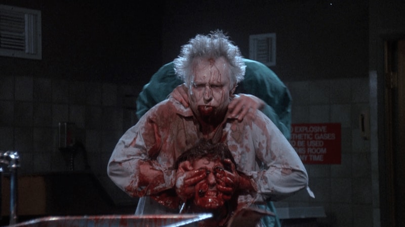 From there, the young Herbert returns home to Arkham where he is a student at Miskatonic University. There he meets his future partner in science Dan Cain, played well by Bruce Abbott. West’s foil is the bitter and aloof neurosurgeon and professor, Dr Carl Hill. Caught in the midst of these relationships is fellow med student Megan Hasely, played bravely by Barbara Crampton. Hasely is the daughter of the faculty’s Dean and a constant fixation for Dr Hill. As Coombs’ experiments and singular desire to overcome death takes hold, carnage breaks loose in Arkham and in the morgue of Miskatonic University. The acting is surprisingly good given the B-grade fare of the film. Coombs plays a role he was born for and Abbott carries the film as the narrator. Events are largely told from his perspective, and he provides the emotional core of the film. Crampton is excellent but underused as Megan.