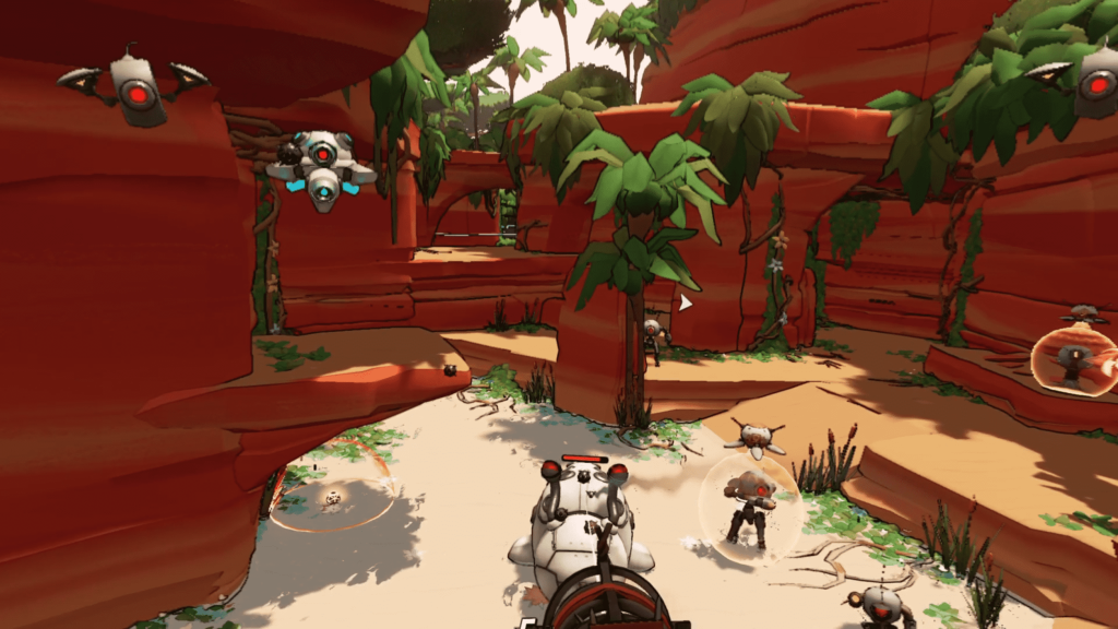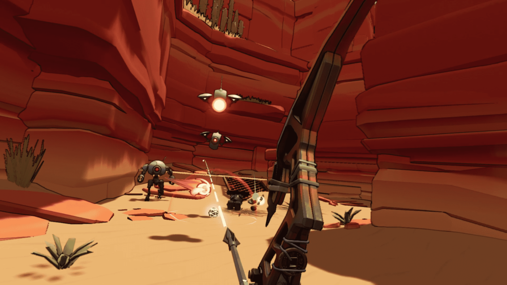 Roboquest VR embraces a bold, stylized aesthetic. Flat colors, thick outlines, and clean geometry translate extremely well to PSVR2’s resolution. The art direction keeps visuals clear even when a dozen projectiles are flying at your head. Enemy silhouettes are easy to read, attacks are highly legible, and effects never drown the scene in noise. Performance is also strong. Even during late-game boss fights with wild amounts of activity, the frame rate held steady throughout my time with it. The environments won’t stun with detail, but the consistency and clarity matter far more in a speed-driven shooter like this.