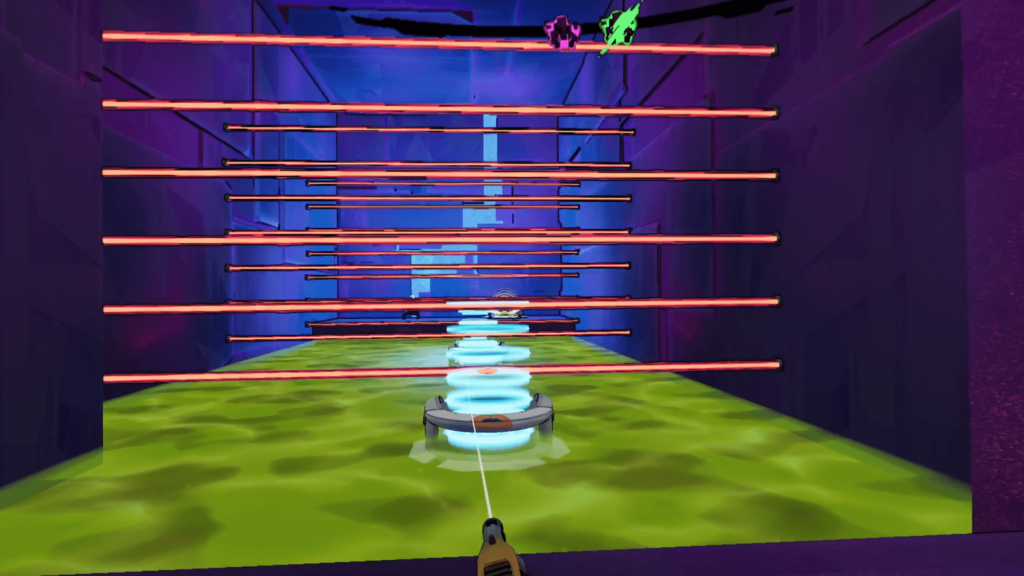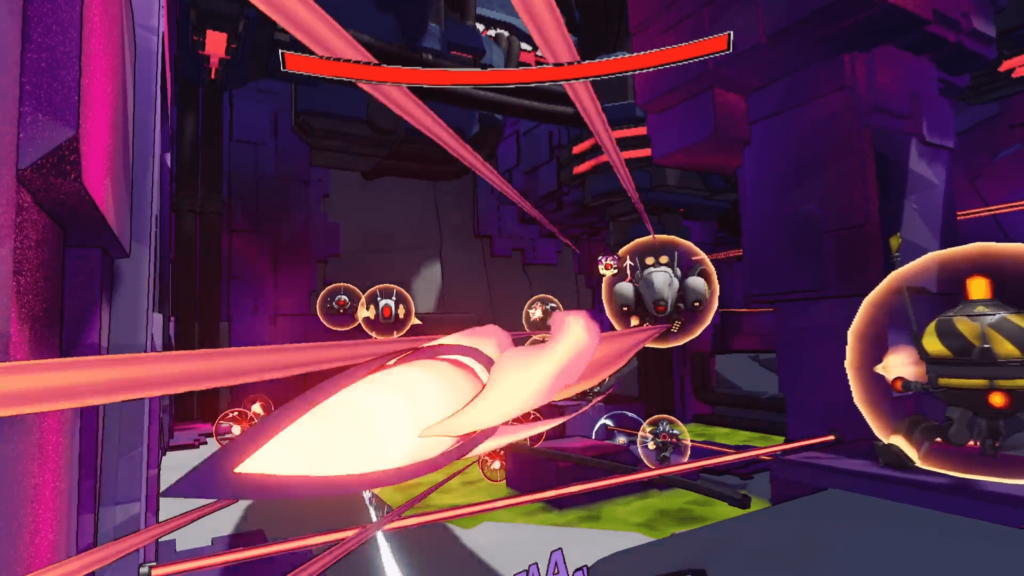Controlling the Guardian in VR works really well. The game is built around high mobility such as sprinting, double jumping, sliding, and rail grinding and in VR these actions demand far more focus and physical awareness than on a flat screen. Early areas ease you in with mild skirmishes, but it doesn’t take long before rooms lock down and waves of enemy types flood in. Some blind you, others freeze you in place, some reverse your controls, and others pelt you with lasers, grenades, or surprise melee ambushes. The enemy variety means you must be adaptable and constantly moving. Static play simply isn’t viable.