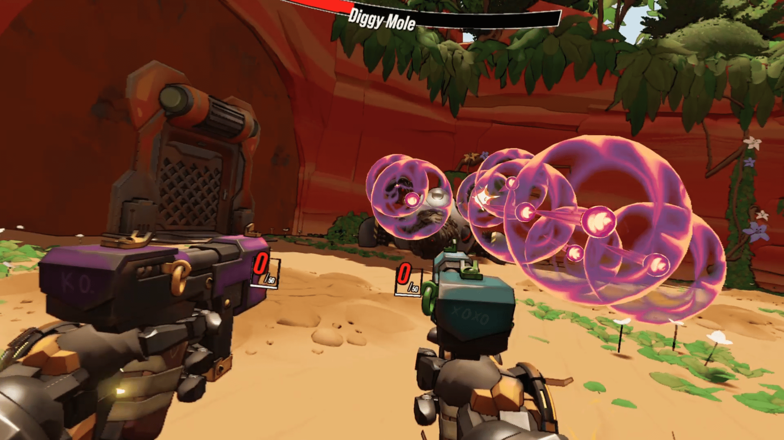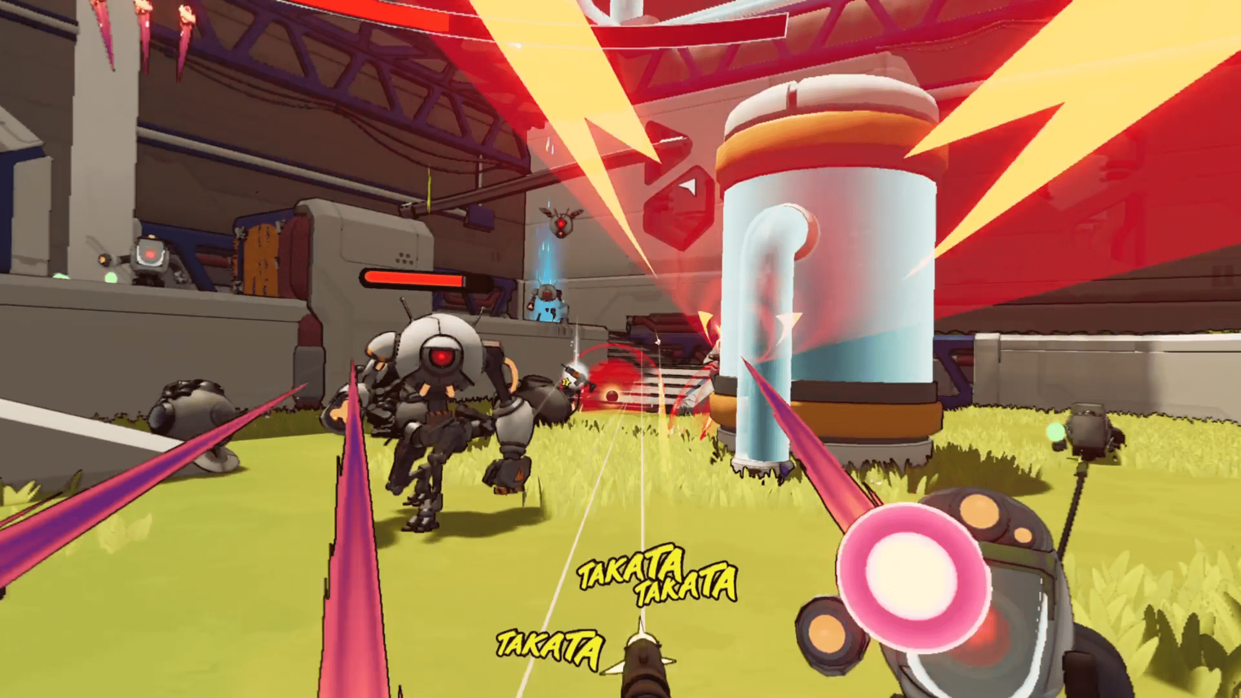Roboquest VR embraces a bold, stylized aesthetic. Flat colors, thick outlines, and clean geometry translate extremely well to PSVR2’s resolution. The art direction keeps visuals clear even when a dozen projectiles are flying at your head. Enemy silhouettes are easy to read, attacks are highly legible, and effects never drown the scene in noise. Performance is also strong. Even during late-game boss fights with wild amounts of activity, the frame rate held steady throughout my time with it. The environments won’t stun with detail, but the consistency and clarity matter far more in a speed-driven shooter like this.