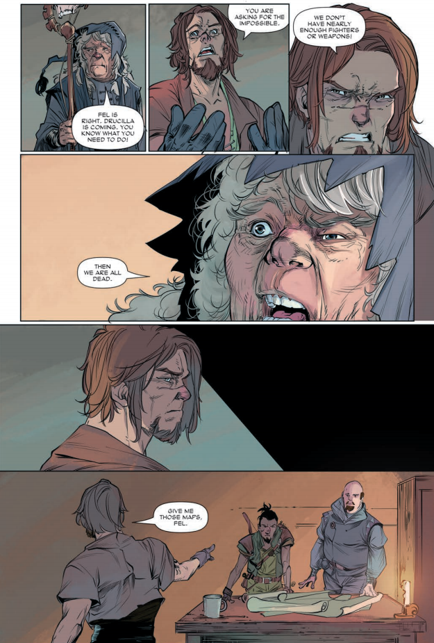 It’s great to finally see Rose and Thorne together, even if they are trapped, cornered and stuck in a pretty hopeless situation. They aren’t the only ones stuck in a pickle however, as the rebels are getting ready to face Drucilla and her army. Outnumbered, under prepared and ill-equipped for the impending battle, I’m feeling for these rebels, as they have a hard slog ahead of them. I found that there is a lot of tension in this issue, and I particularly enjoyed the heated exchange between the knight, Dante, and the fallen Guardians. Even though they are both loyal to Drucilla, there is immense conflict between them, which seems to be how Drucilla likes it…the crafty wench! I’m also intrigued with what Drucilla has planned for the rebels. We know that she doesn’t mess around, and the fact that she is there personally leading her army against them is a curious development. Her presence is ominous, and this has the rebels greatly troubled, as they see her as some kind of harbinger of doom! It feels like she is making this journey so as to finally squash this rebellion and put an end to the resistance, for once and for all. The Queen is used to getting what she wants, so it’ll be interesting to see how this unfolds.