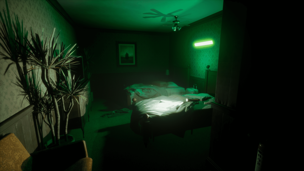 Control-wise, the game impresses early. Charles moves and turns with a noticeable responsiveness that many indie first-person horror titles struggle to achieve. Navigation feels good, and the brisk turn speed makes tight corridors and chase sequences manageable. A few quirks stand out, such as the limited vertical look angle that feels like Charles can’t fully tilt his head up or down, and the odd continuous vibration when the blacklight is active. The latter takes getting used to, especially since it slightly drowns out the ambient soundscape, but it’s more of an odd design choice than a serious drawback.