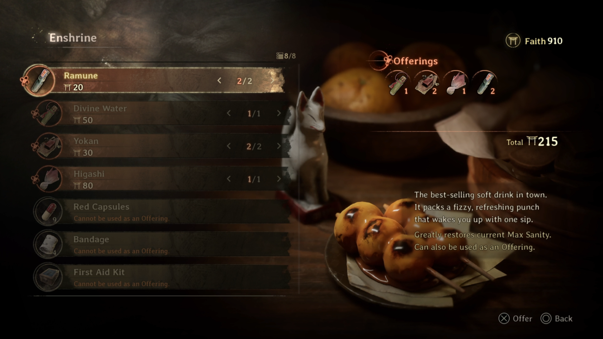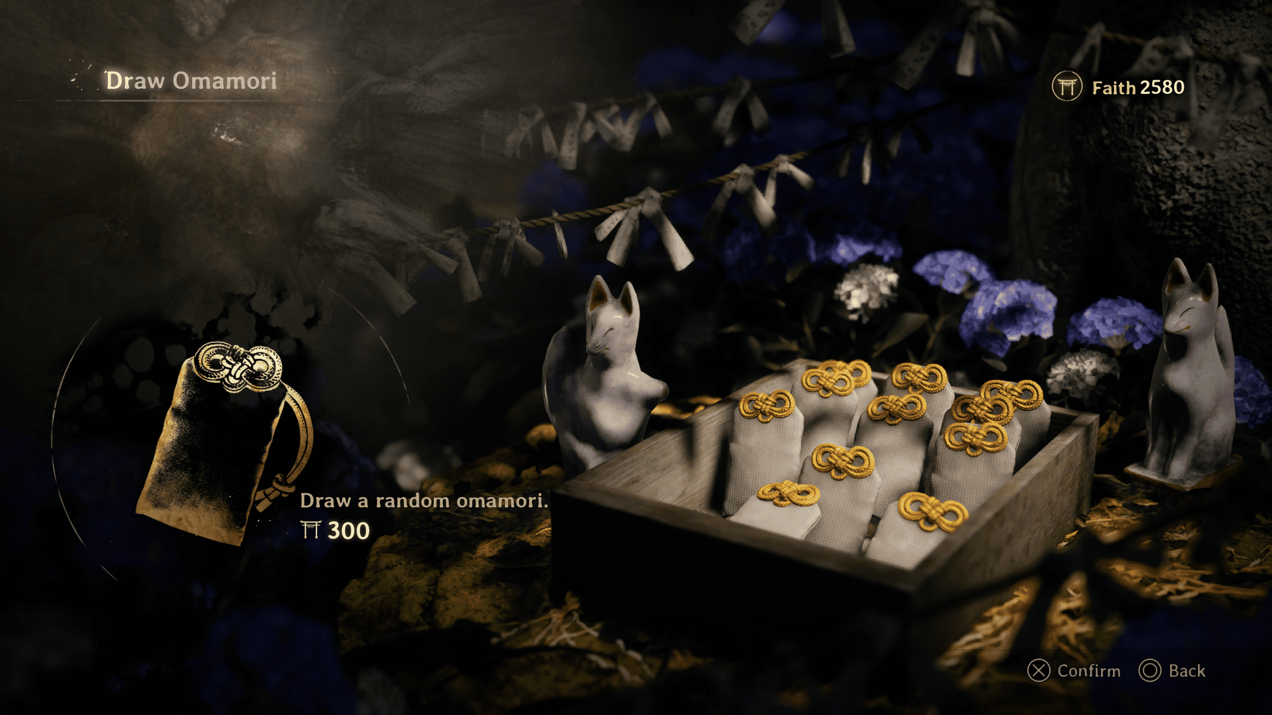 Hokora shrines serve as the game’s hub mechanic. They allow you to save, restore sanity, and spend Faith (earned by sacrificing consumables) to upgrade Hinako’s health, stamina, or sanity, provided you’ve collected Ema tablets. Alternatively, you can draw random Omamori charms that grant buffs like slower weapon degradation, improved dodging, or better sanity recovery. Balancing short-term survival with long-term investment becomes one of the most satisfying parts of the game.