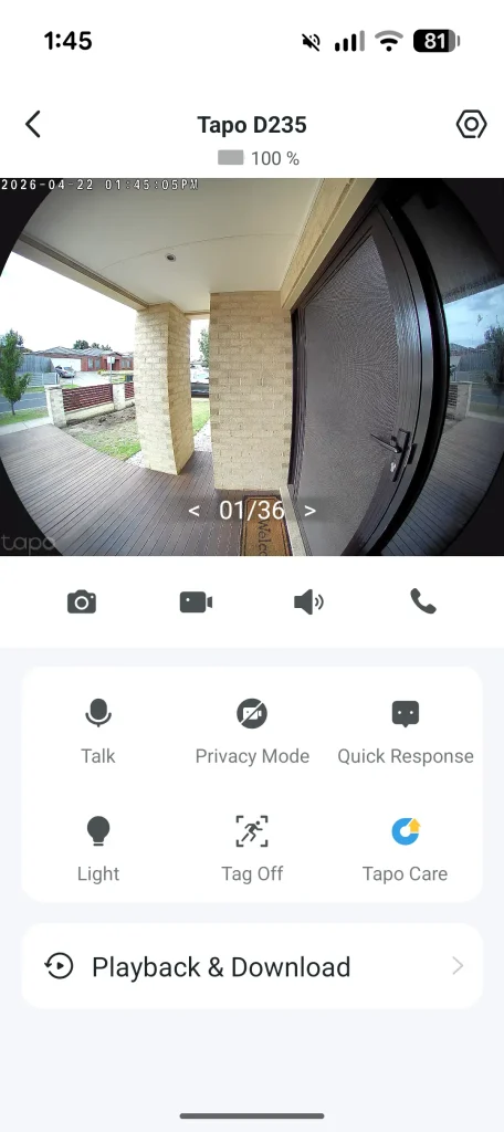 When it comes to video and audio performance, the Tapo Video Doorbell Camera really can’t be faulted, thanks to its 2K (5MP) lens that delivers exceptionally clear and vibrant footage, even at night which clearly allowed me to see the person. It also supports a Head‑to‑Toe view with a 180‑degree DFOV, though the effectiveness naturally depends on where you place the device—something Tapo helps with through an excellent placement tutorial. Having used many Ring devices over the years, which are also great in their own right, the D235 is currently my pick because it’s a true one‑off purchase with no ongoing membership required. Like Ring, it’s compatible with Matter devices and home assistants such as Alexa and in my case, setup wasn’t needed at all since I already had other Tapo products running in my home. The Tapo D235 video doorbell features a direct “ring-to-call” function that acts like a VoIP call providing immediate two-way audio communication on your phone.