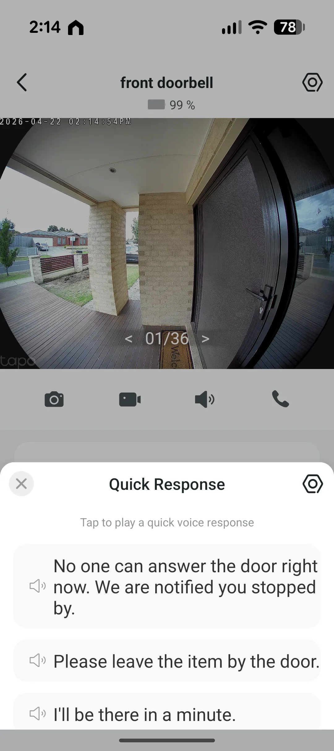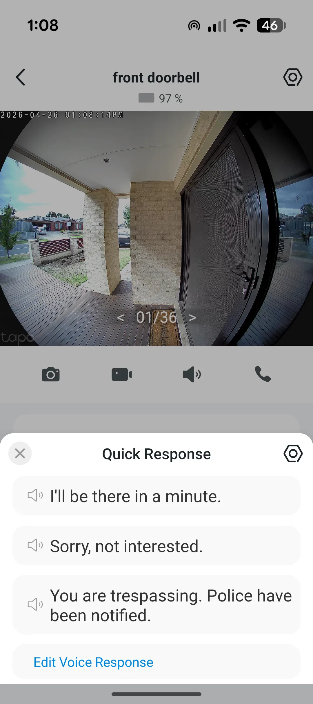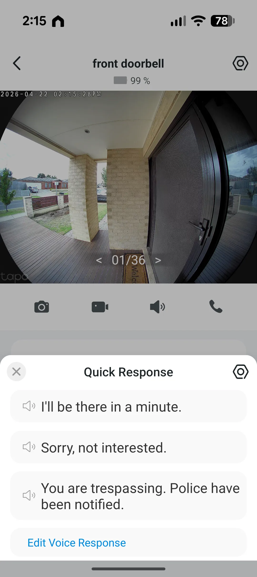 Even non‑video Alexa devices receive audible notifications. You can choose between a male or female voice for announcements and the Tapo app itself delivers an impressive level of customisation—or you can simply install it, set it up and forget about it. The app also lets the doorbell send quick‑response messages such as “I’ll be there in a minute,” “Please leave them by the door,” or the more assertive “You are trespassing. Police have been called.” Additionally, you can take photos, record video, make calls to the device, review playback and download recordings directly from the app.