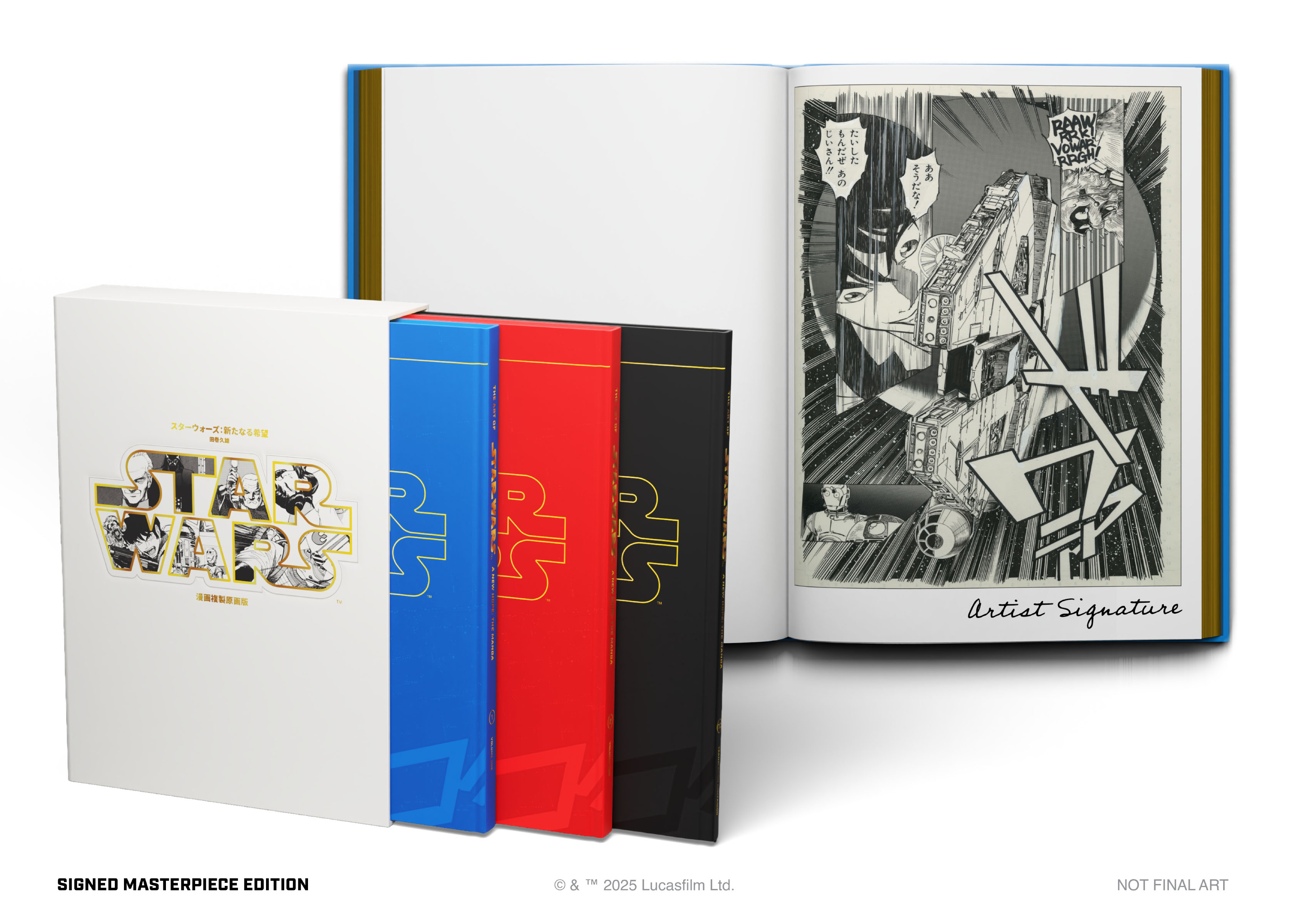 - The Collector’s Edition is a two-volume hardcover set presenting Tamaki’s artwork in high resolution, with Kickstarter-exclusive cover and a new English translation that’s taken directly from Tamaki’s handwritten Japanese text. This edition is perfect for fans looking to read the masterful adaptation for the first time, with the new translation included in the margins to preserve the original Japanese lettering. The books are printed on archival-quality stock to showcase Tamaki’s intricate linework and rich tones. While a retail version featuring a different cover will be available in 2026, the Kickstarter-exclusive Collector’s Edition features exclusive designs distinguished by bold use of blue and red —a visual nod to the light and dark sides of the Force, as well as special treatments that will not be offered anywhere else.
