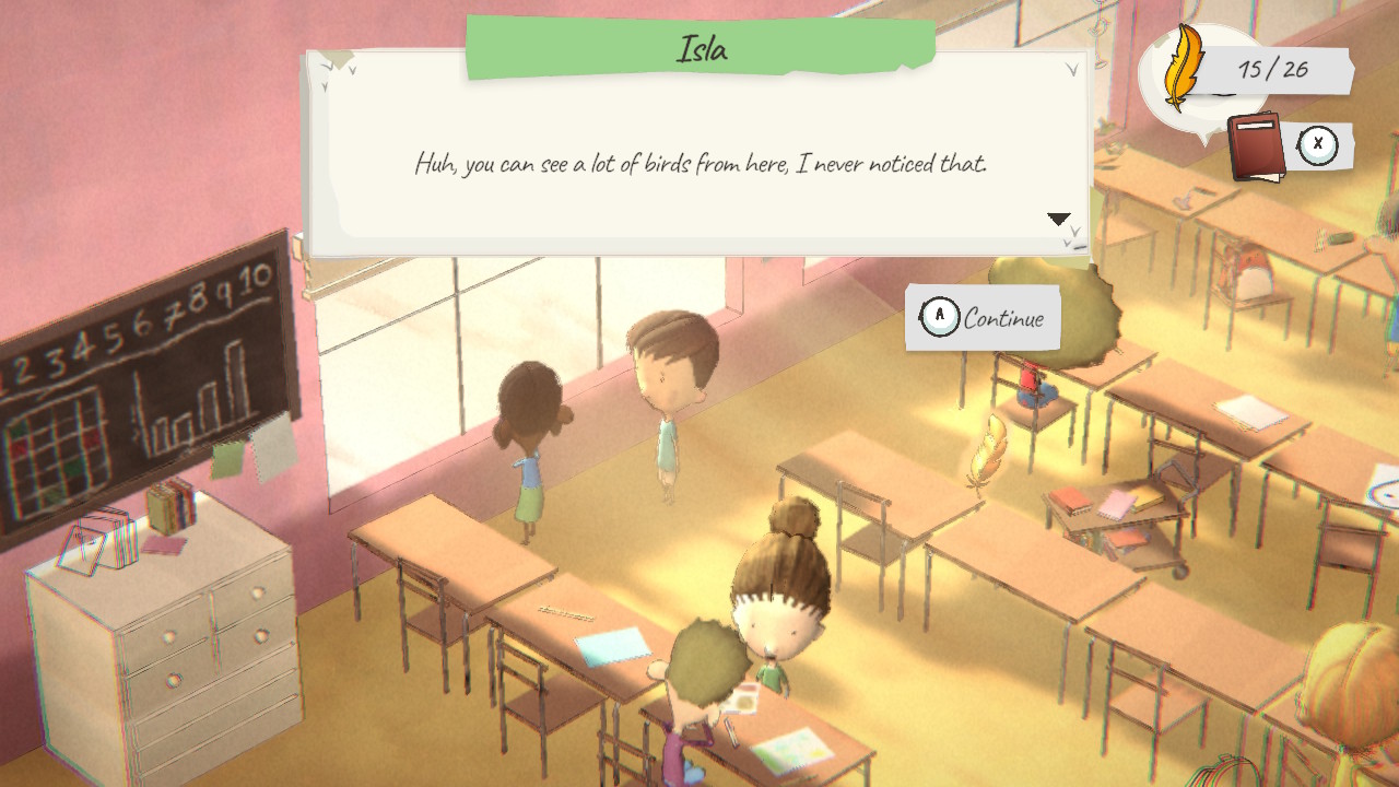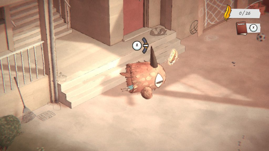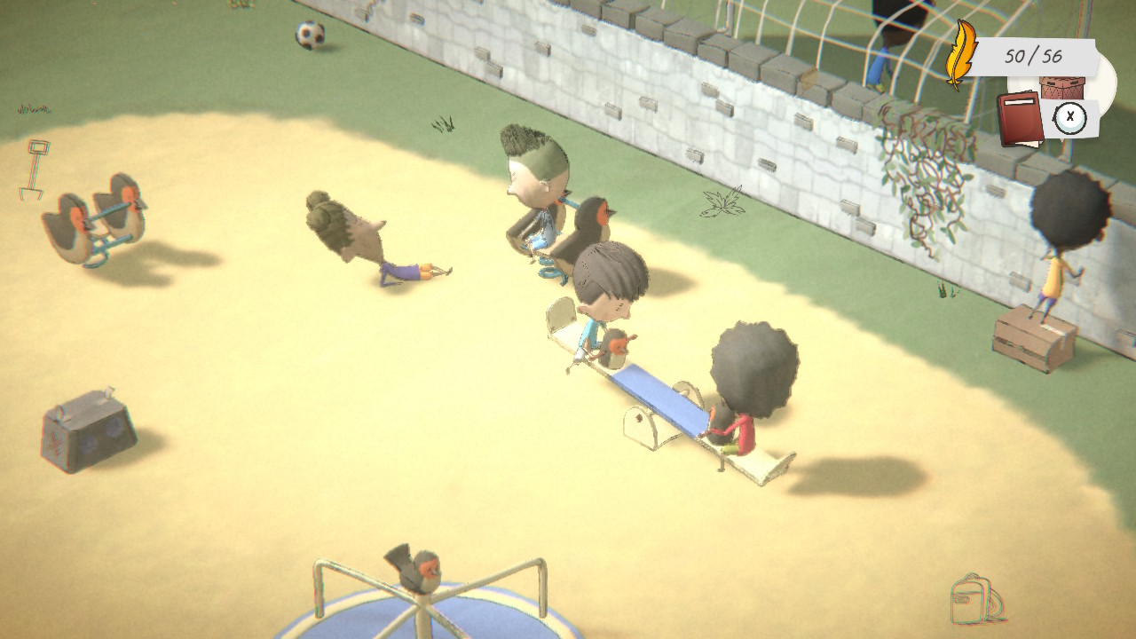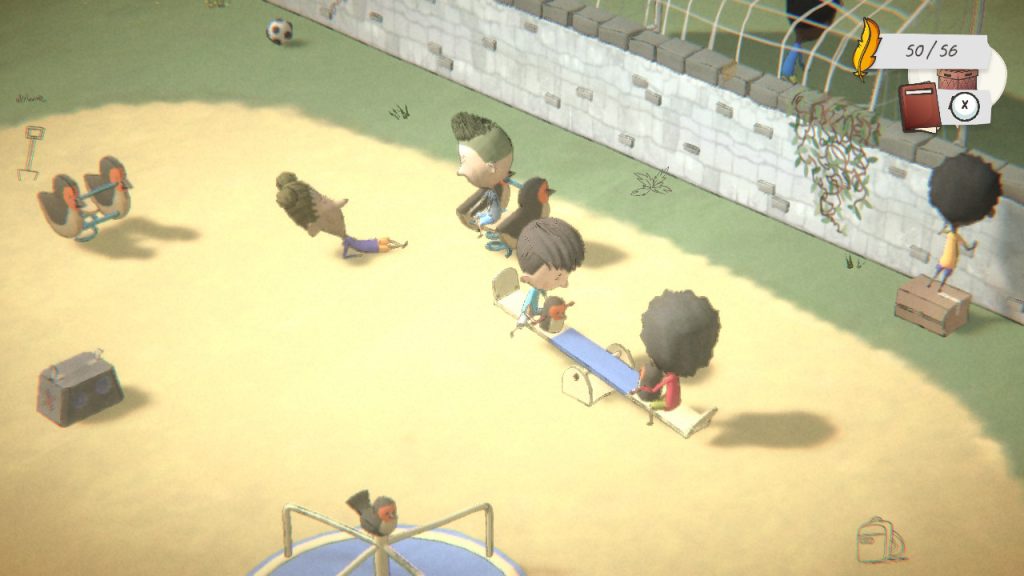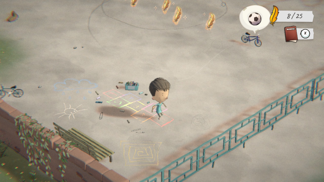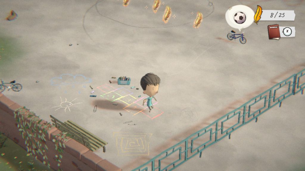 Gameplay is broken into four chapters, each made up of small sections that you can revisit whenever you like. You guide Frank through everyday activities, completing light objectives within compact environments. These tasks range from making toast for your dog to stepping in when kids argue, or gathering leaves and sticks in the park. There’s a gentle rhythm to it all, where interaction and exploration blend naturally. Golden feathers are scattered throughout each area, encouraging you to look around and engage with everything. You also earn feathers by completing small activities like hopscotch or stacking books into a pyramid. They give you something extra to do, though they don’t unlock anything meaningful, which makes them feel more like optional collectibles than a real incentive.