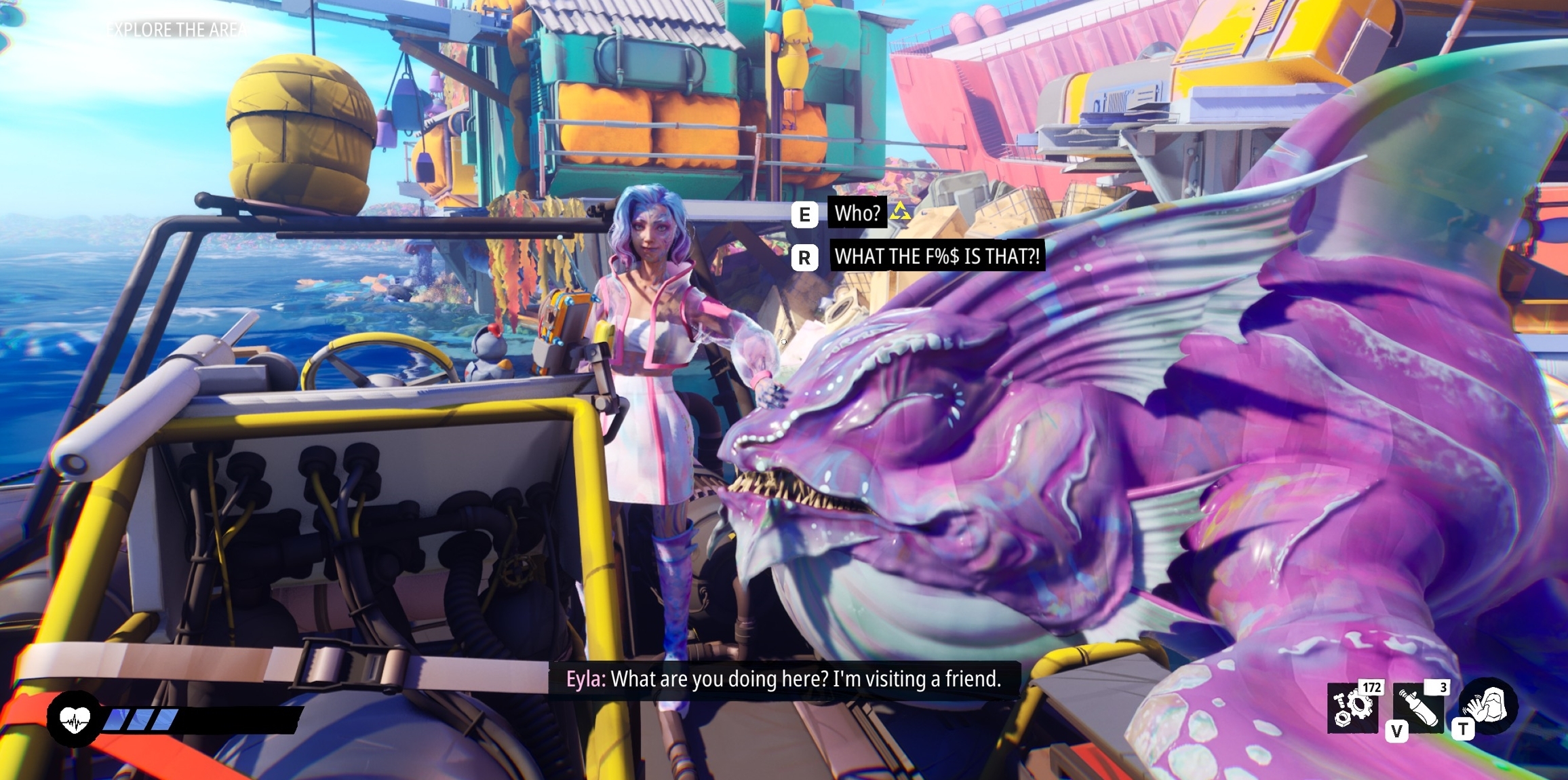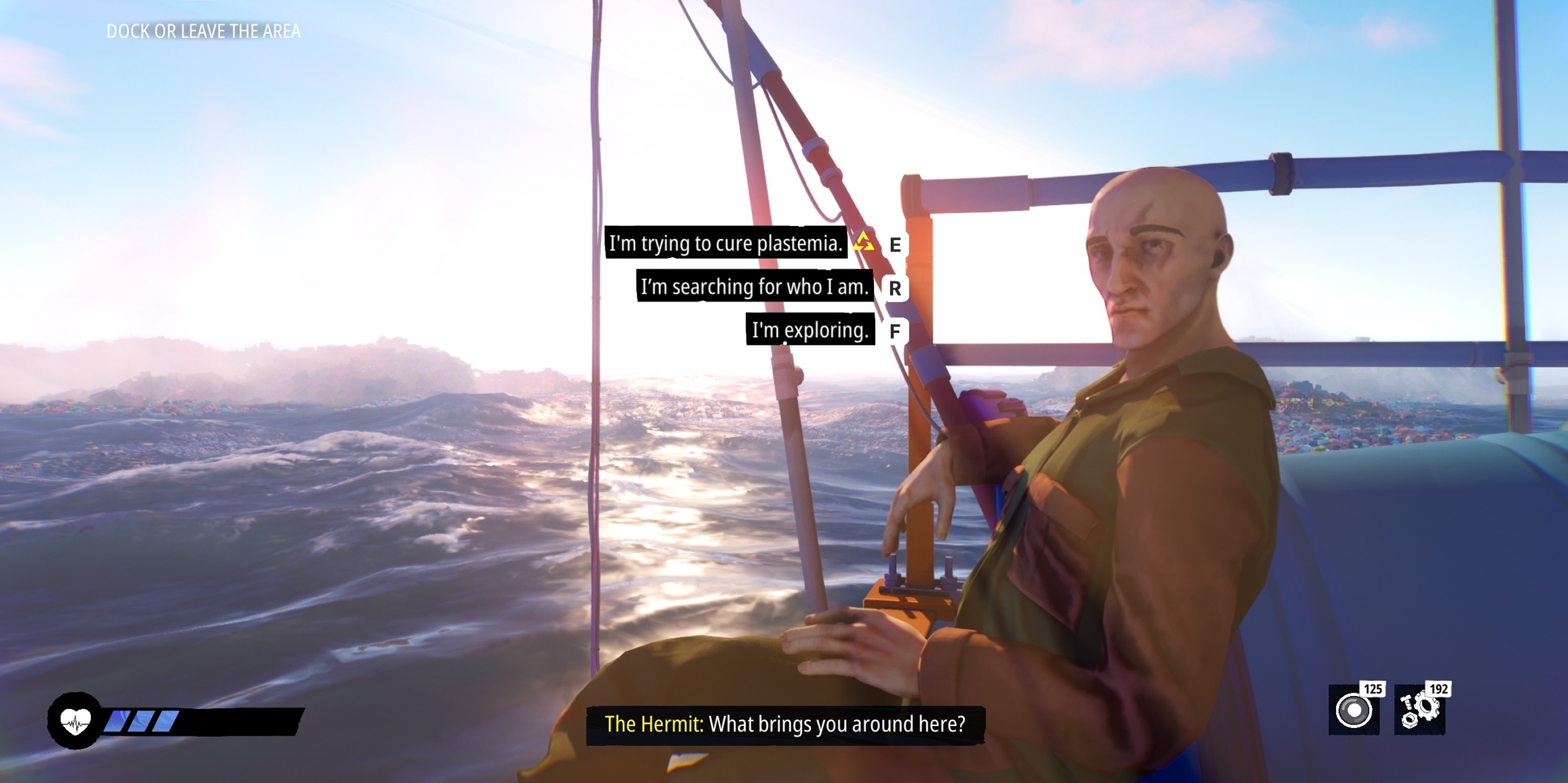 But most of Tides of Tomorrow is just a classic, single‑player choice‑based game — just with the interesting wrinkle of following another player’s story. The world and its design are beautiful. The whole world is flooded and covered in plastics, tonnes and tonnes of plastic bottles and other rubbish having taken over the seas and dotting the human‑made floating settlements that remain. The game revolves around a few different factions: oppressive Marauders, Reclaimers just trying to live and survive, and Mystics who follow the ancient ways of the “Deltas” — the people who were around before the world was overtaken by Plastemia.