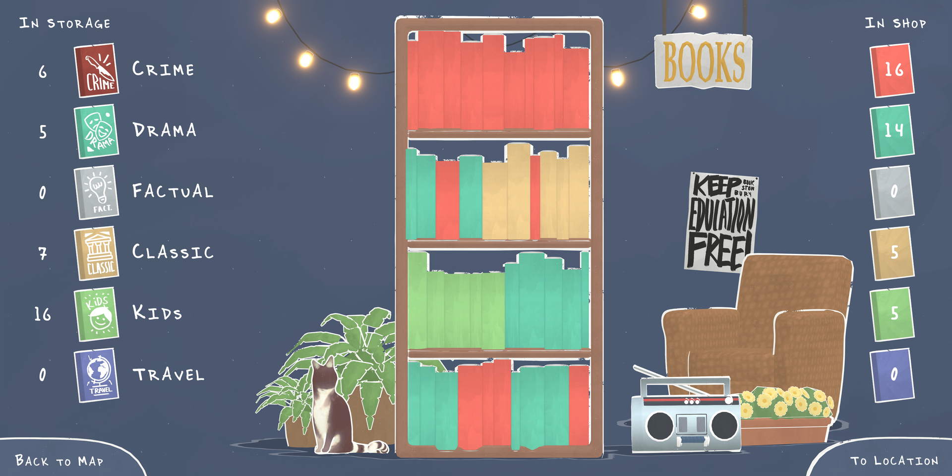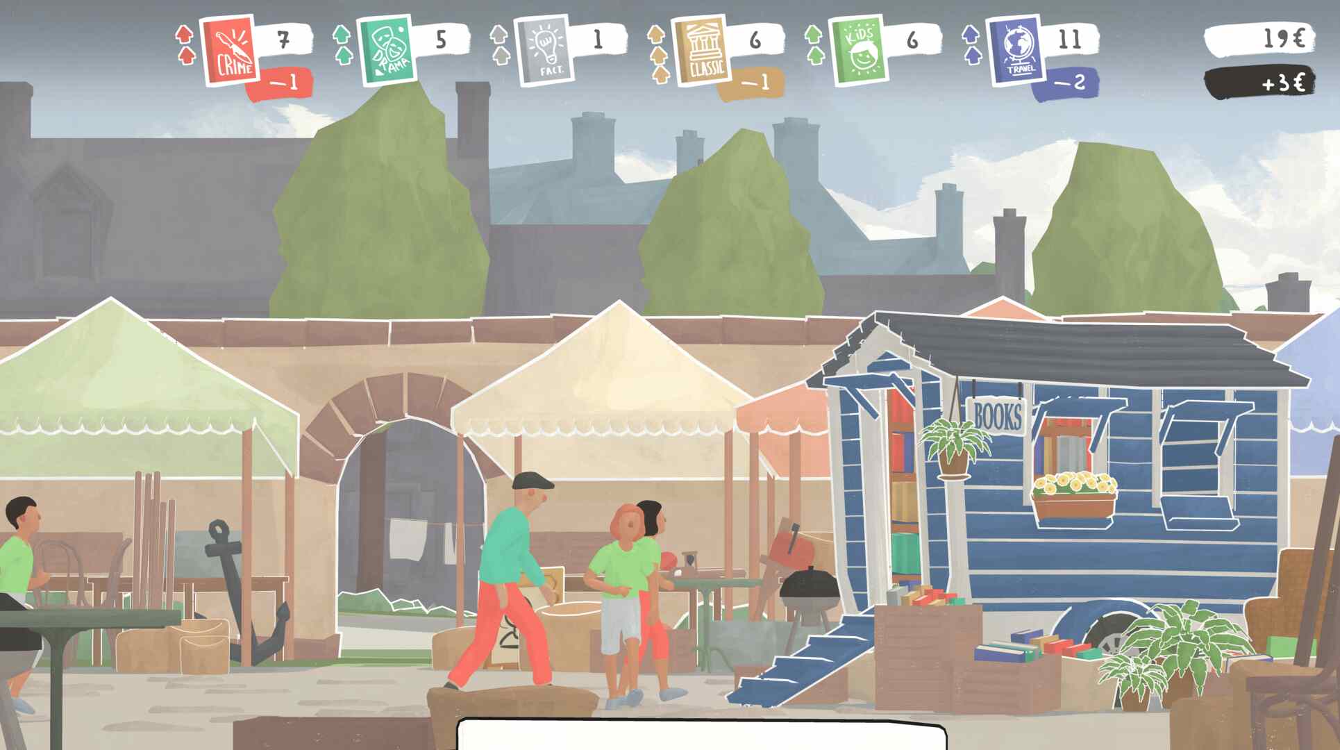 And it’s this same undeniable charm that makes Tiny Bookshop such an enjoyable time. As a new vendor in the seaside resort of Bookstonbury, it’s up to you to establish your bookstore-on-wheels and bring fresh reading material to the town’s inhabitants. Doing so involves a simple, addictive gameplay loop split between stocking your shelves and opening up your store for daily business. Make decent sales, and you can invest in more stock and decorations to kit out your store, the latter of which can give you helpful boosts, such as improving the sales of certain genres.