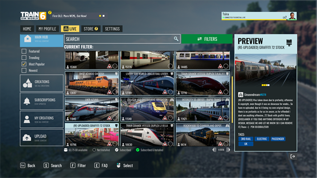Probably the most important other feature is the creators hub, here you can create, edit and share liveries for any and all trains you have in your collection. It’s a really cool feature because you can see what other players have created and all of them have such amazing creativity. From a livery to support those in Ukraine still fighting their war, to special liveries, like this one I found with a gaming motif style. It really makes me feel like I’m back in Japan with their special themed trains. A great way to bring a slash of colour to the game.