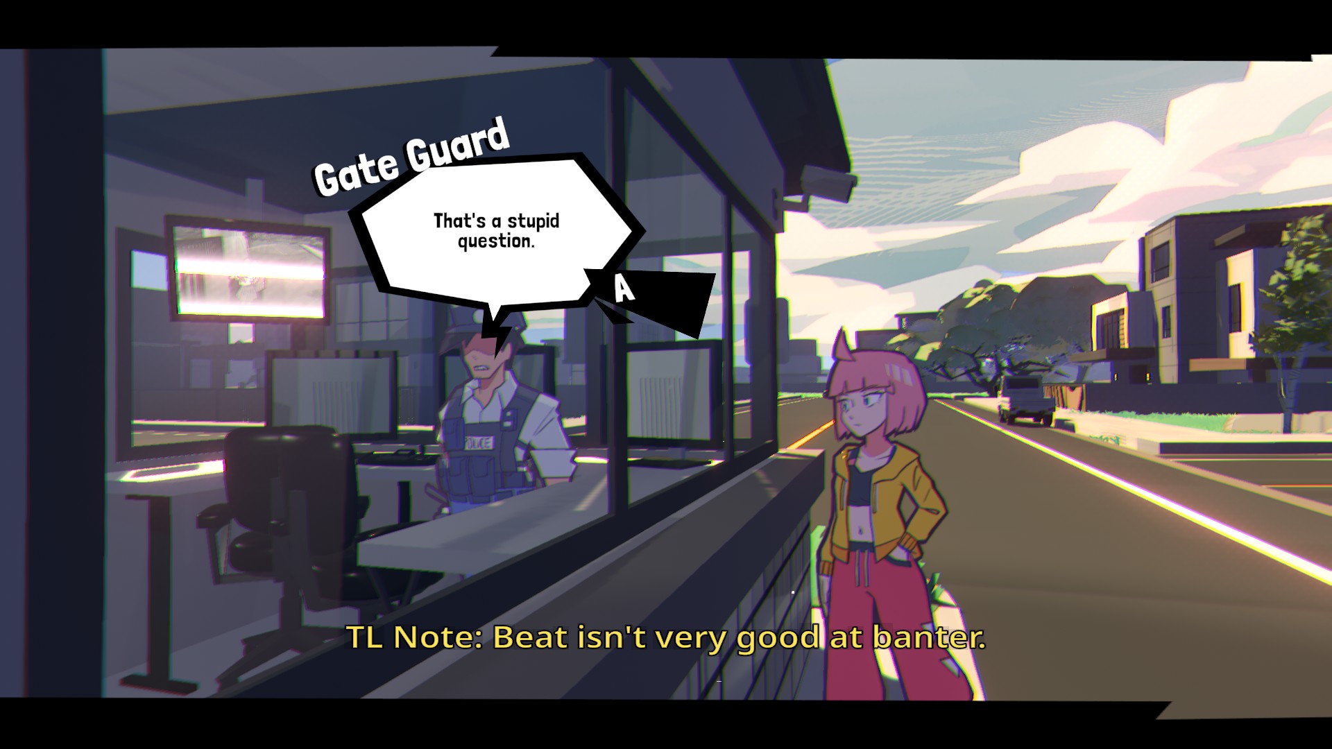 In contrast to the modern feel of its prose, the graphical style is a nostalgic love letter to retro 2D animation, particularly that of ’80s and ’90s Japanese anime and manga; character sprites are 2D in the 3D environments, somewhat akin to the early Danganronpa games, there are several gags pertaining to ‘TN’ (translator’s note) in the vintage yellow anime subtext, certain cutscenes collapse to a 4:3 aspect ratio, and the entire game has a heavy VHS glow and film grain post-processing. Even in the story itself, protagonist Beat has an attachment to her Walkman tape player rather than an MP3 player or mobile phone. I have to say I’m also very big into the Nintendo Wii-inspired health and safety splash screen before the game even starts.