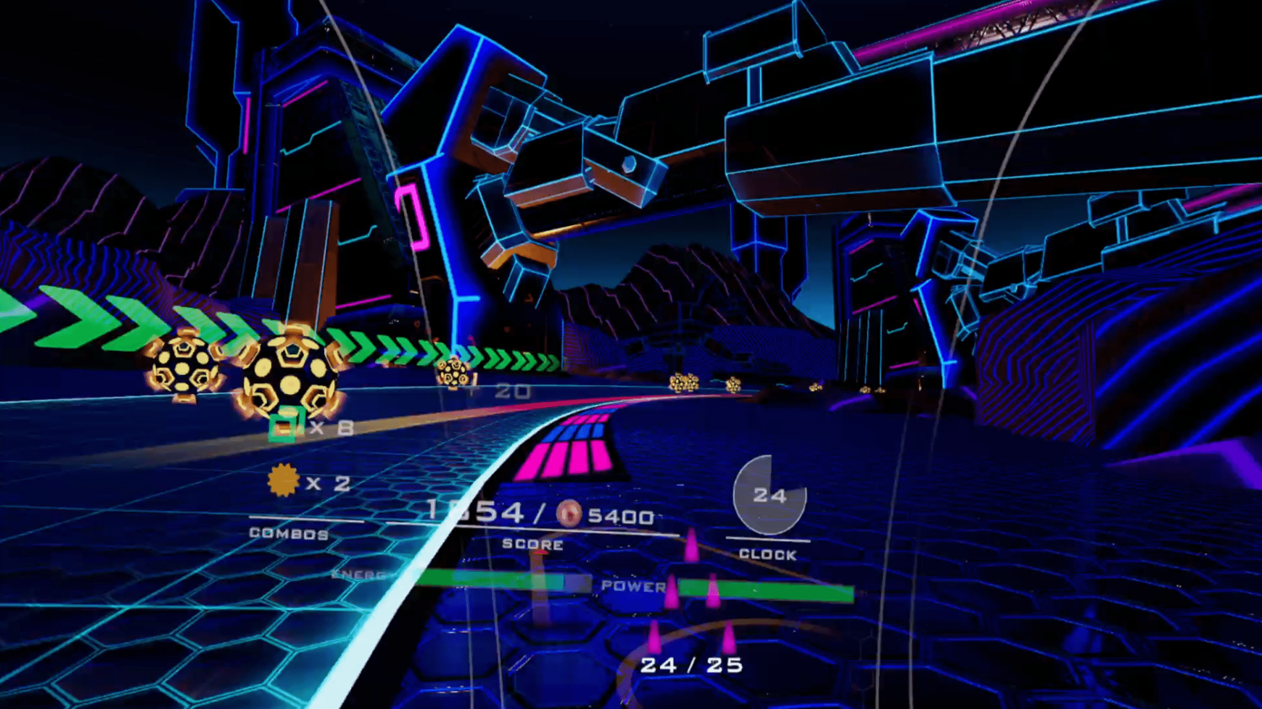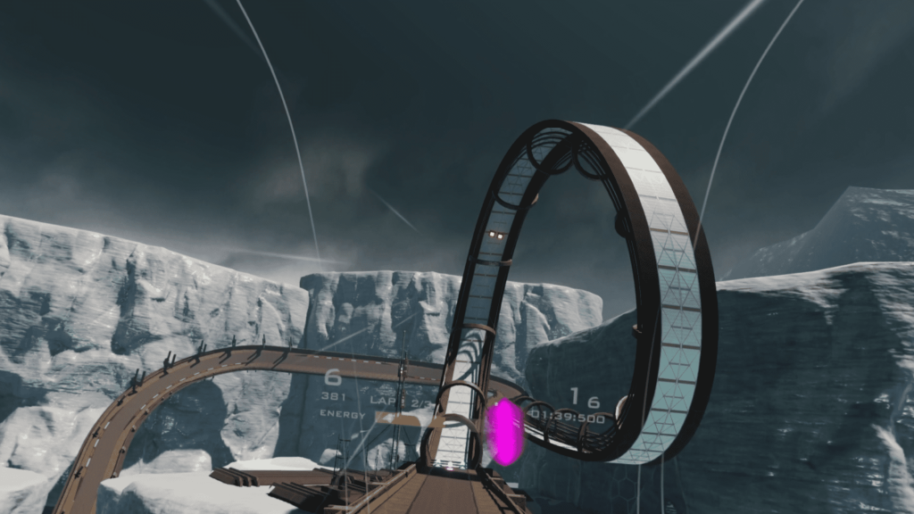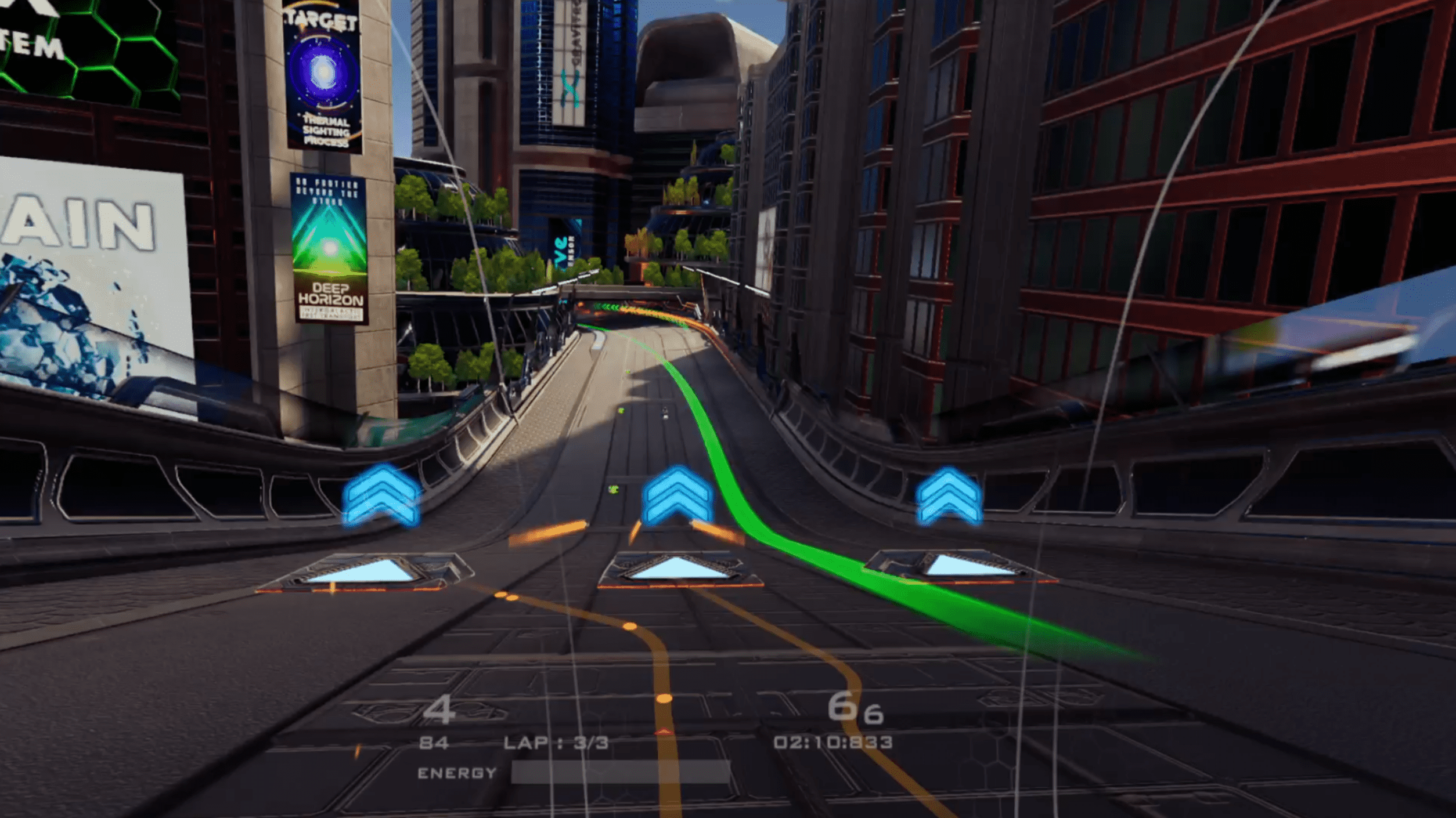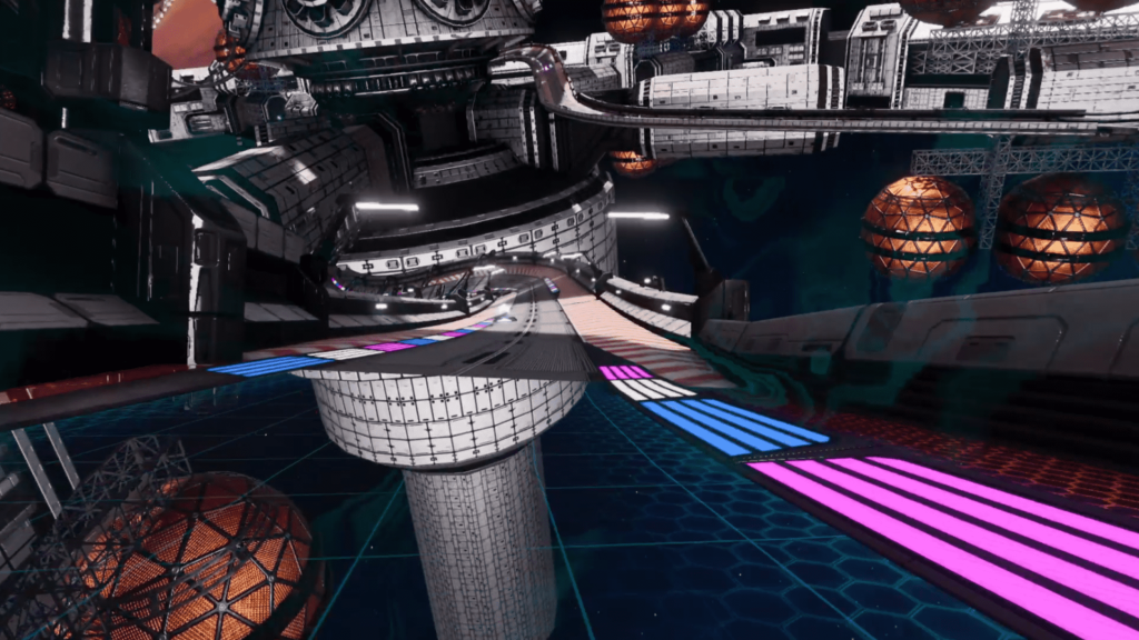 Visually, V-Racer performs admirably on PSVR2. While the art style leans toward clean lines and futuristic simplicity, environments still offer depth and enough visual markers to maintain clarity even at high speeds. The tracks look good, the image remains stable, and performance is rarely an issue. The only frequent visual hiccup is a slightly abrupt “thump” when landing from large jumps, which doesn’t break the game but is noticeable the first few times. Track variety is the one area where the visuals feel constrained. The neon cities and cosmic highways look great, but some color palettes repeat, and a few environments blur together aesthetically. More distinctive biomes like lush green worlds, volcanic reds, or icy blues, would help future expansions feel more pronounced. Fortunately, new tracks are reportedly in production, so this critique may age well.