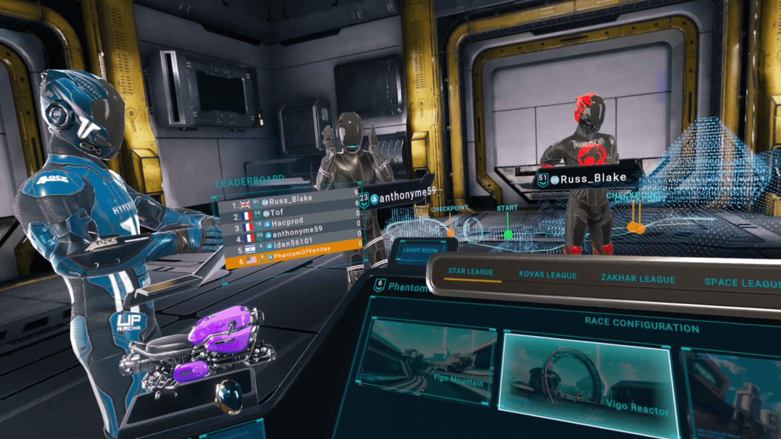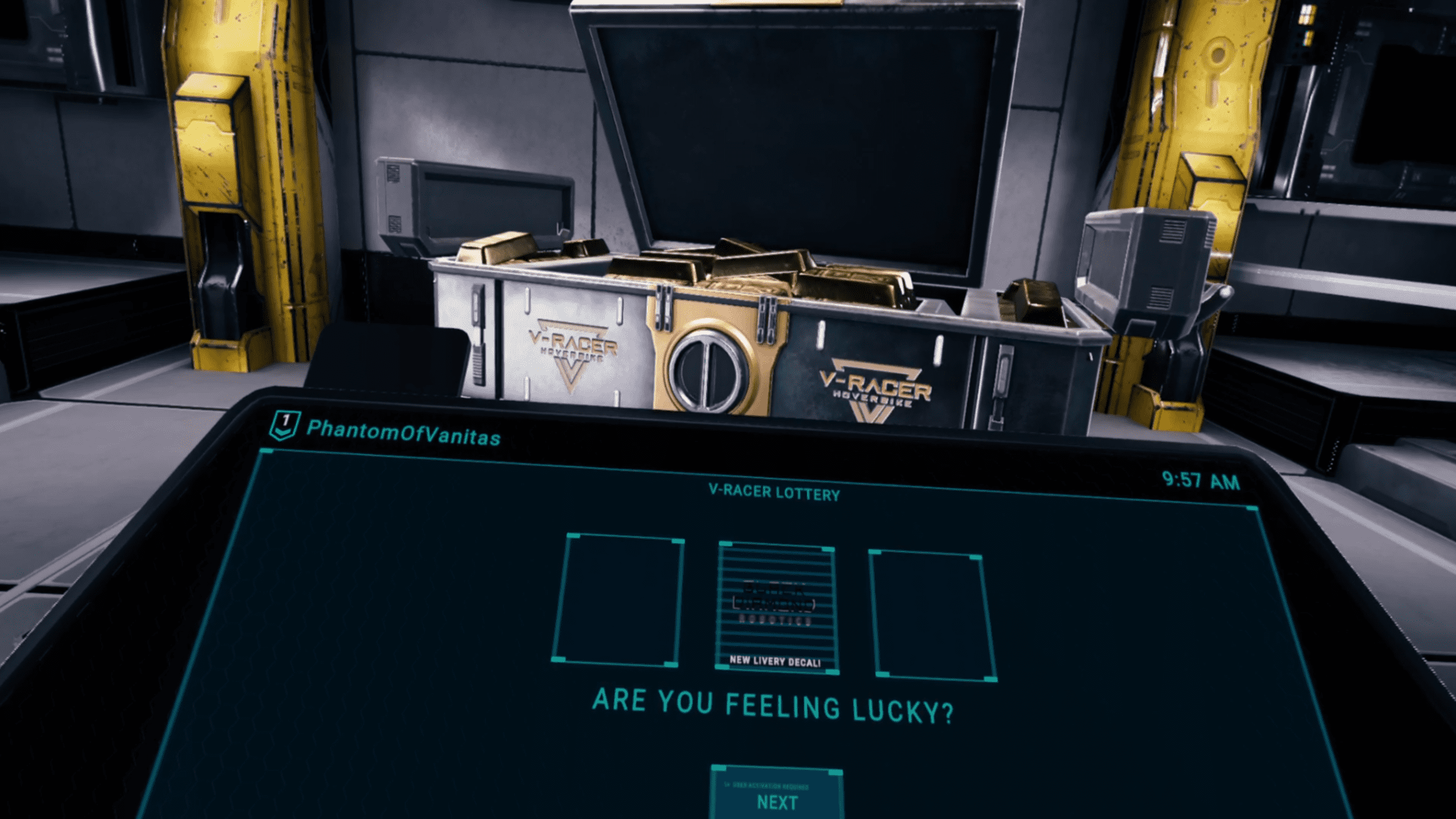 Beyond the racing itself, V-Racer packs a respectable suite of extras. The in-game clock is a small but hugely welcome feature; not every VR game remembers that real-world time still exists. Leaderboards encourage friendly competition, and the replay system is unusually robust, letting you view races from multiple angles, adjust playback speed, switch riders, and save highlights. Customization is another strong point thanks to the full VR livery editor. Extras are unlocked primarily through in-game currency earned by completing races and challenges across Career, Multiplayer, and Online modes. You can spend this currency on new bikes, suits, and helmets, while additional rewards come from random post-race prize selections or loot boxes, which offer bonuses like extra gold, unique liveries, or temporary gold multipliers for upcoming races. You can design bike skins, rider suits, and helmets using brushes, decals, stamps, and text tools, and the results in multiplayer lobbies are often impressive. It adds a personal investment that goes beyond performance; your ride becomes part of your identity.