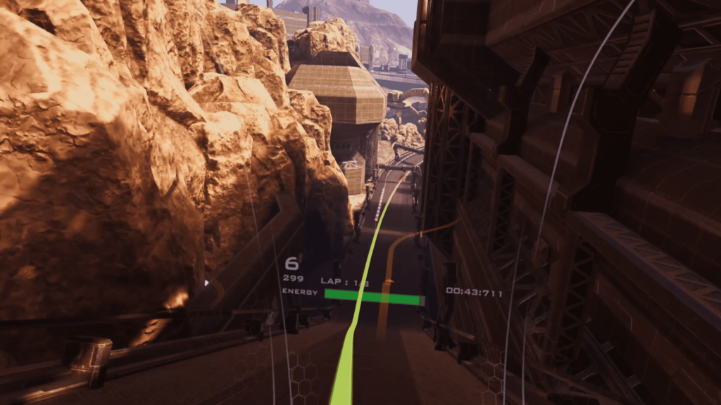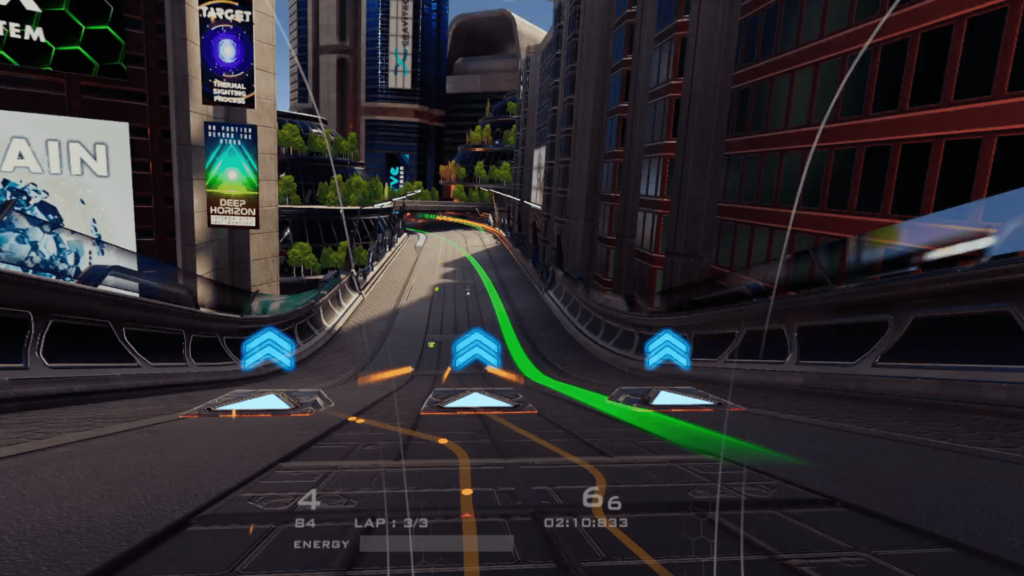 V-Racer’s control implementation demonstrates a clear focus on precision and responsiveness. The game defaults to head-lean steering, asking you to guide the hoverbike by shifting your head and torso rather than your whole body. The onboarding is unusually clear for a VR title and actively encourages you to reposition your bike at the start of a race to find your most natural stance. Acceleration and braking use the Sense triggers, while combat abilities and energy trades are mapped to face buttons. For anyone seeking an even more tactile feel, counter-steer mode turns the controllers into virtual handlebars. Those who want something lower-impact can steer with the analog sticks or even use a one-handed layout. The versatility is impressive, and what matters most is that every control scheme feels sharp and immediate. I didn’t encounter any input inconsistencies, which is crucial for a high-speed racer. This reliability is a big part of why the game becomes so addicting.