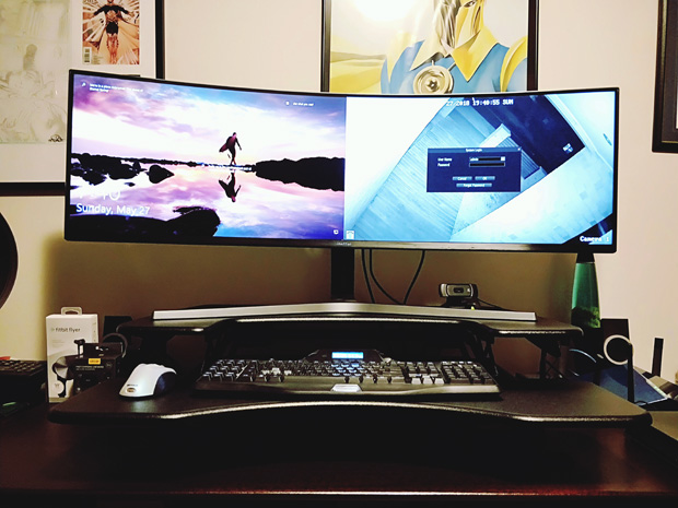 As mentioned earlier in this review, gamers will be pleased to know that the Varidesk Pro Plus 36” supports dual monitors or my situation, our Samsung C49HG90 49in QLED Ultra-Widescreen 144Hz Gaming Monitor which weighs 15kg and has a 48.9” (124.2cm) screen which is a behemoth in itself. The Varidesk Pro Plus 36” holds up to 35lbs or 15.88kg so we just squeezed in with the Samsung C49HG90 49in QLED Ultra-Widescreen 144Hz Gaming Monitor. I also tested the Varidesk Pro Plus 36” with a “normal” monitor and you can definitely feel the difference in weight when raising it which is like a feather.