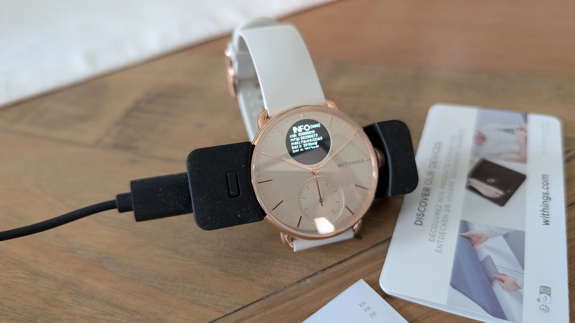 Navigation is handled entirely through the rotating crown on the right side of the watch: rotate to scroll through menus such as heart rate, steps, ECG, SpO₂, temperature, workouts, notifications and settings, then press to select. A short press confirms choices, while a long press starts or stops certain functions such as workouts. All customisation—such as which notifications appear, display settings and health features—is managed either through the watch’s settings menu or the Withings app on your phone. To charge, the ScanWatch 2 uses its own proprietary charger (my only gripe), which feels a little cheaper compared to the watch’s premium build.