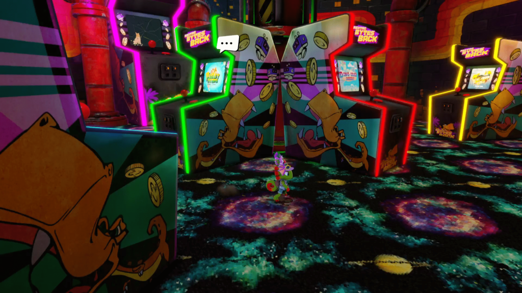 Another highlight is Rextro’s Arcade, which has been completely overhauled. Instead of throwaway mini-games, Rextro now stars in his own playable isometric platformer, adding a fun “game within a game” twist that feels substantial. These sections reward exploration and lend a nostalgic charm, offering a welcome change of pace between collecting sprees. Rextro has an arcade machine set up in every level, but you can visit his actual arcade in Hivory Towers where you can replay any of the games you’ve unlocked at any time.