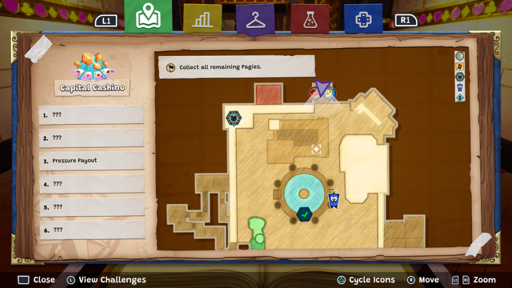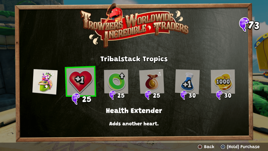 Collecting is still at the heart of the experience, but it’s handled with far more finesse. Pagies remain the key objective, but now you’ll also find Q.U.I.D.S., a new currency dropped by Capital B’s careless minions. These can be used to buy hints from Mark the Bookmark, or cosmetics and Tonics from the returning vending machine, Vendi. Tonics offer creative perks like adding hearts or quirky visual filters and now you can equip multiple at once, allowing players to tailor their playstyle. There’s also Tonics that make the game harder, like adding fall damage, making gameplay more expressive. Other collectibles include piggy banks to chase, ghost writers to find, hidden pirate treasures, and color-coded coin challenges that test reflexes and timing. The sheer variety keeps things fresh and gives younger players constant incentives to explore.